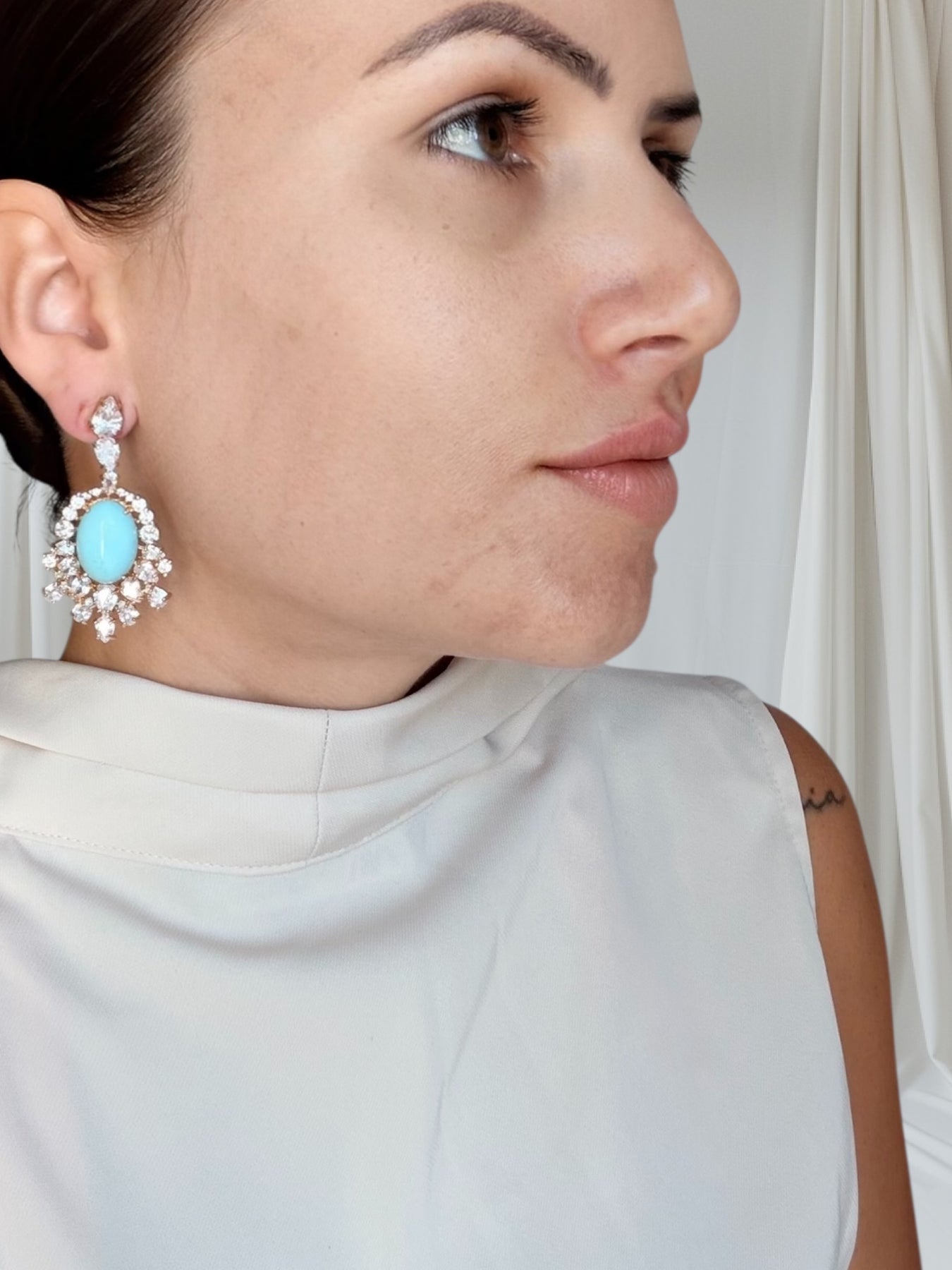 The Crystal earring plated in yellow gold. The earring features a stunning turquoise resin stone as its focal point, complemented by numerous zirconia stones.