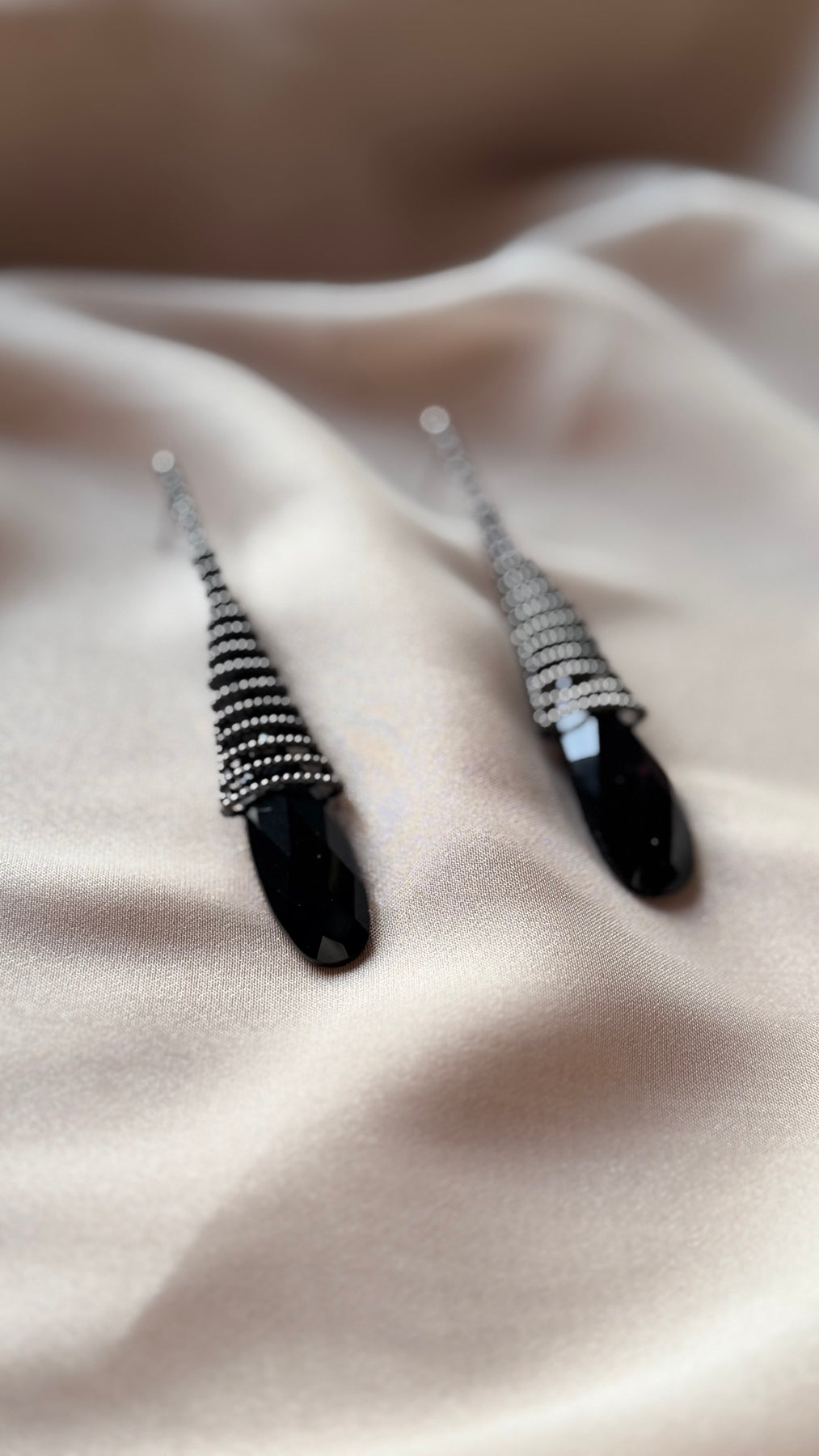Plated in sleek black rhodium, these earrings offer a contemporary and edgy look, perfect for making a statement. At the center of each earring lies a stunning natural onyx stone, with its deep, mysterious black hue enhancing the dramatic appeal of the design.