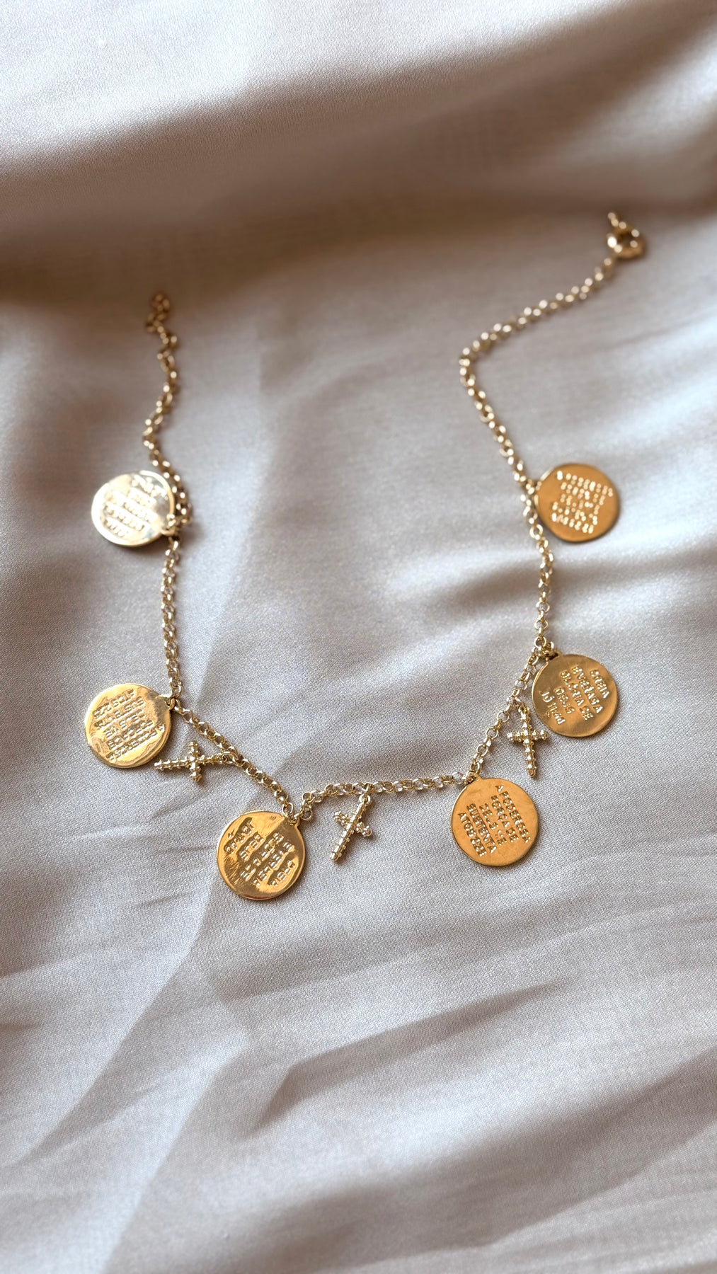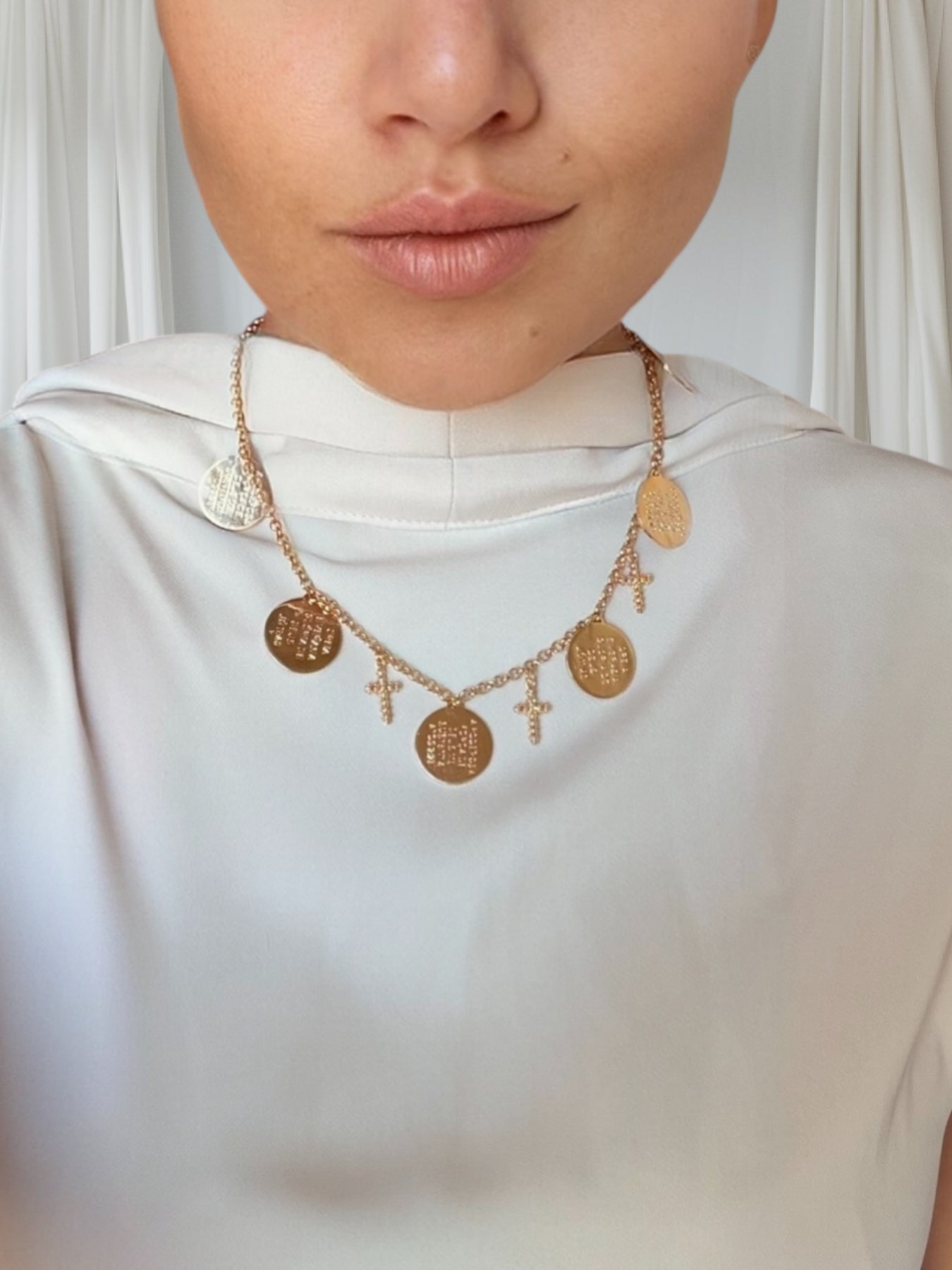 The Medalia Biblica II Necklace, an elegant evolution of the original Medalia Biblica design. This stunning piece is plated in radiant yellow gold and features an intricate Jesus cross, symbolizing faith and devotion.