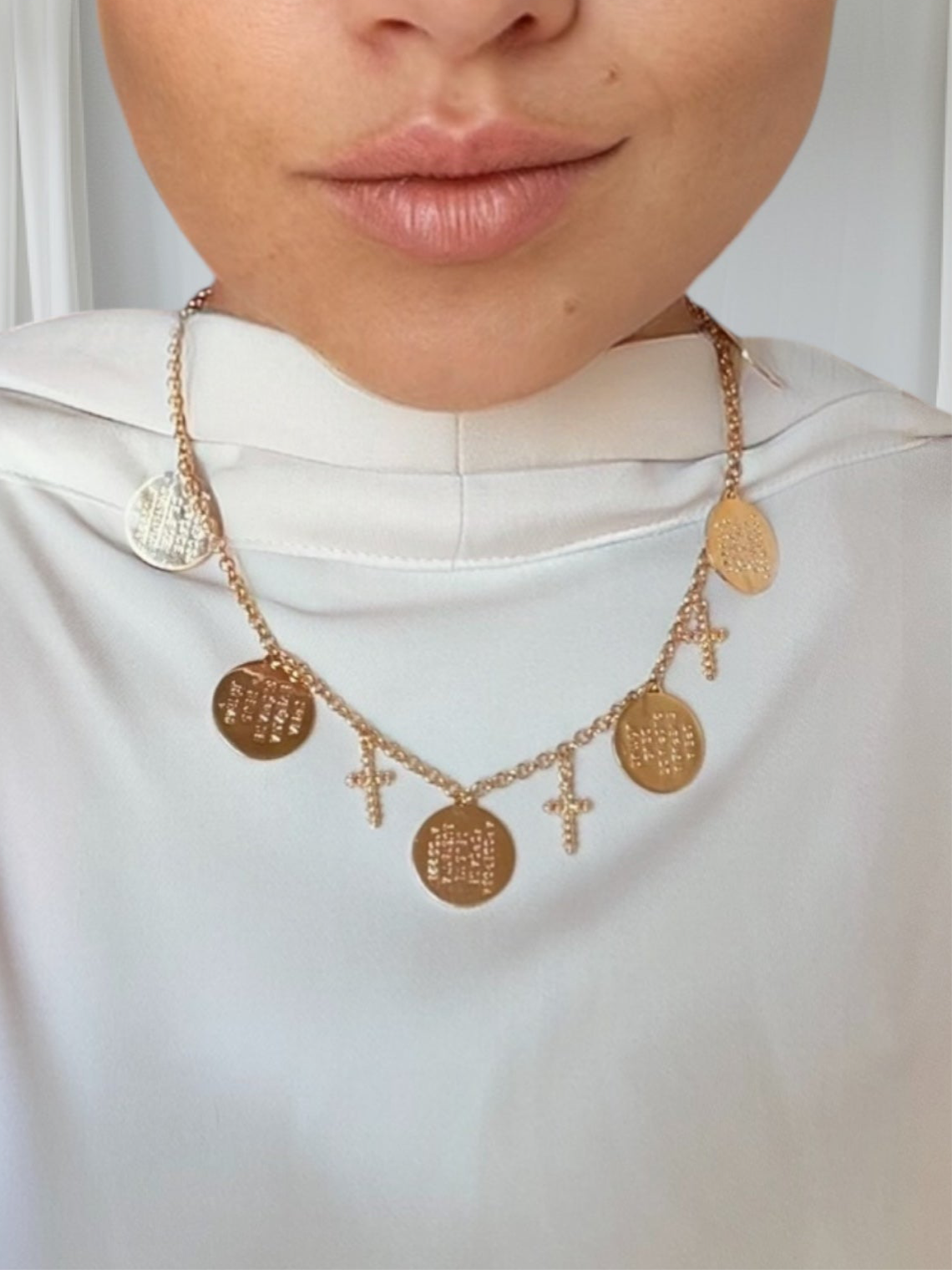 The Medalia Biblica II combines the same uplifting biblical phrases with the powerful imagery of the cross, making it not only a striking accessory but also a profound statement of belief.